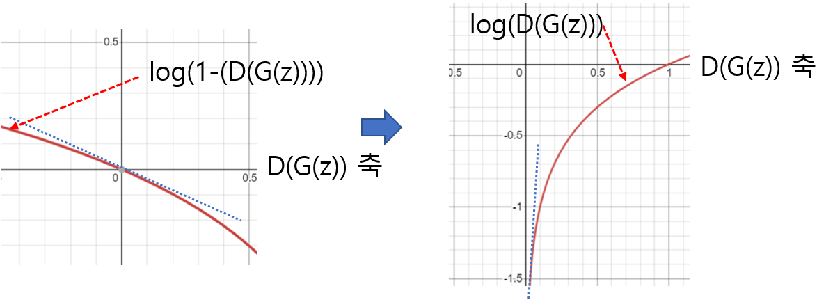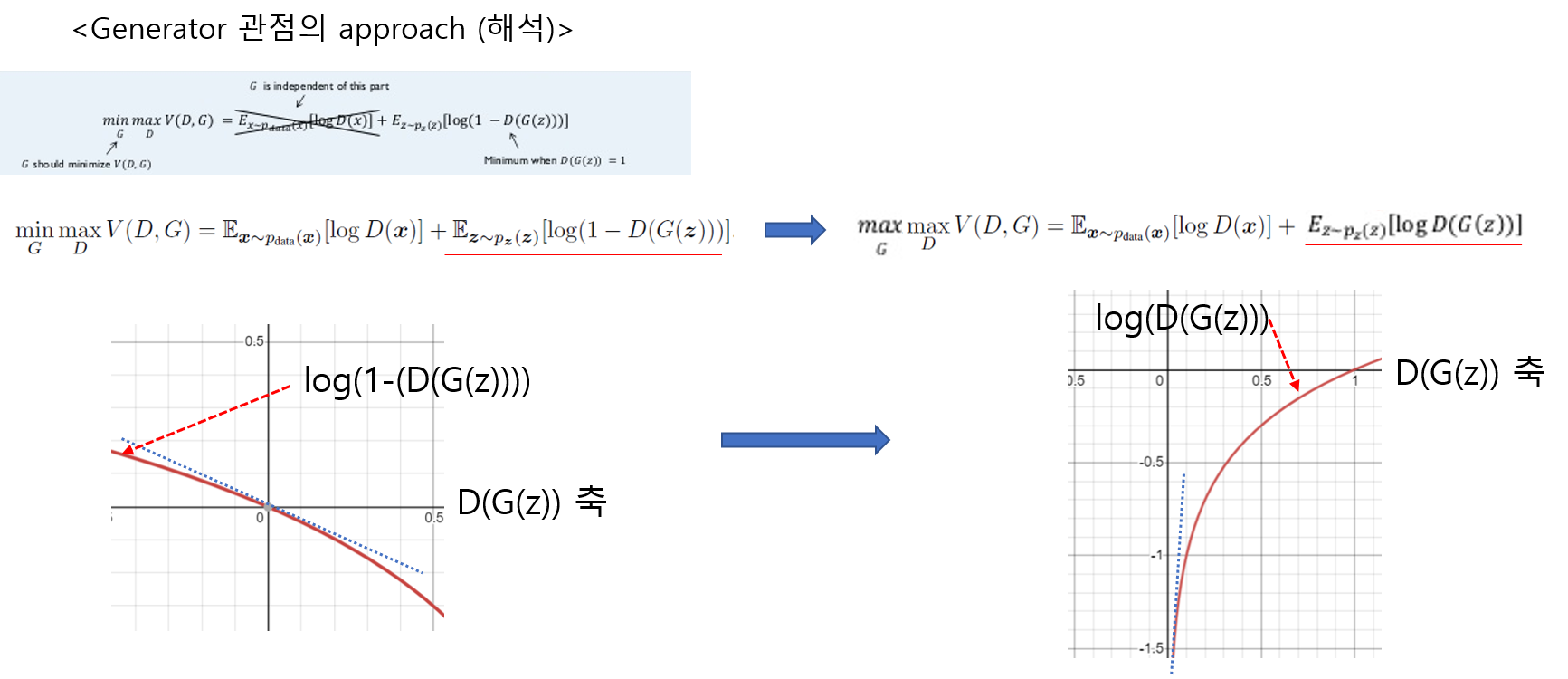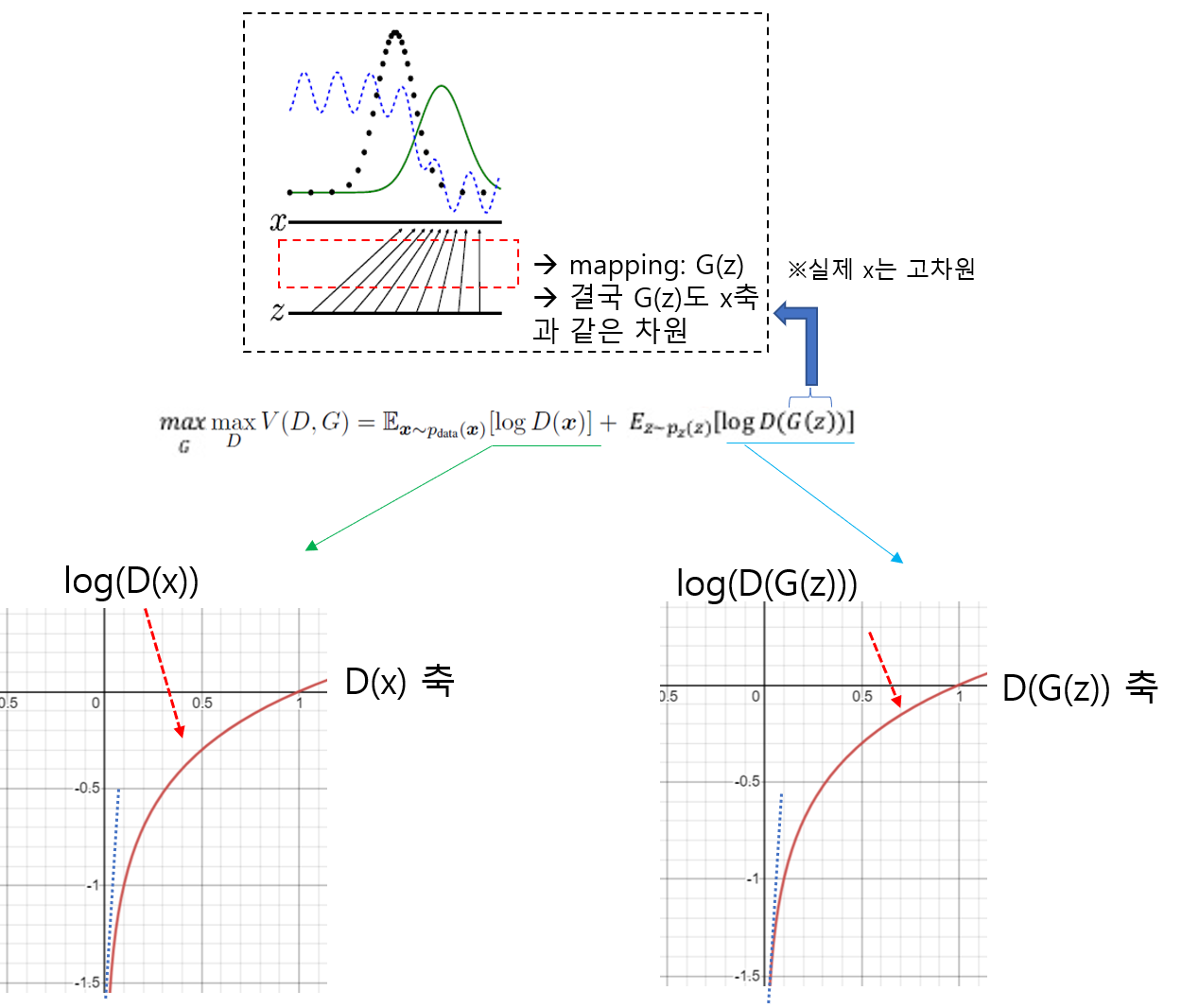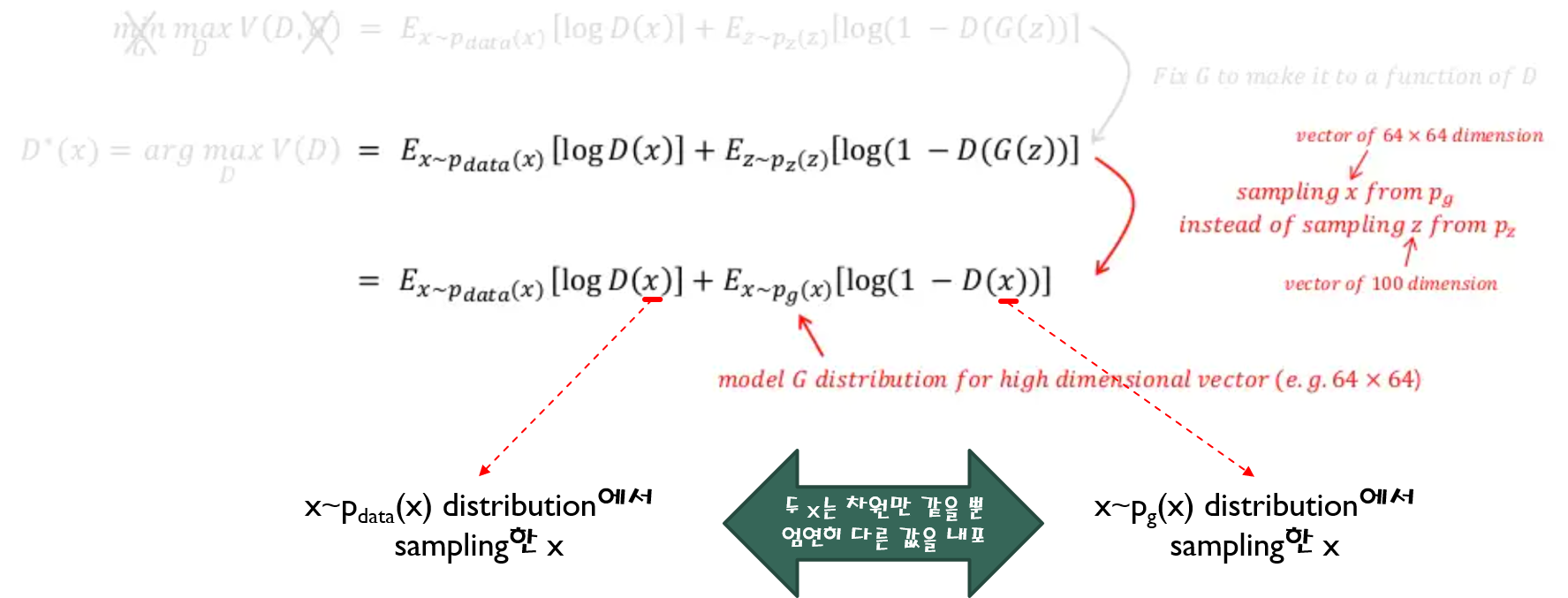 위 수식을 보면 G(z)를 x로 바꿔 주면서 \(E_{z\sim ~p_{z}(z)}\) 수식부분이 \(E_{x\sim ~p_{g}(x)}\) 로 변경된 것을 확인할 수 있습니다. 이것이 가능한 이유는 G(z)의 차원이 곧 X차원과 동일하여 G(z)에서 발생한 값을 X 차원 상의 하나의 x값으로 표현(=mapping)할 수 있기 때문입니다.