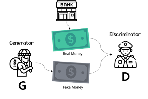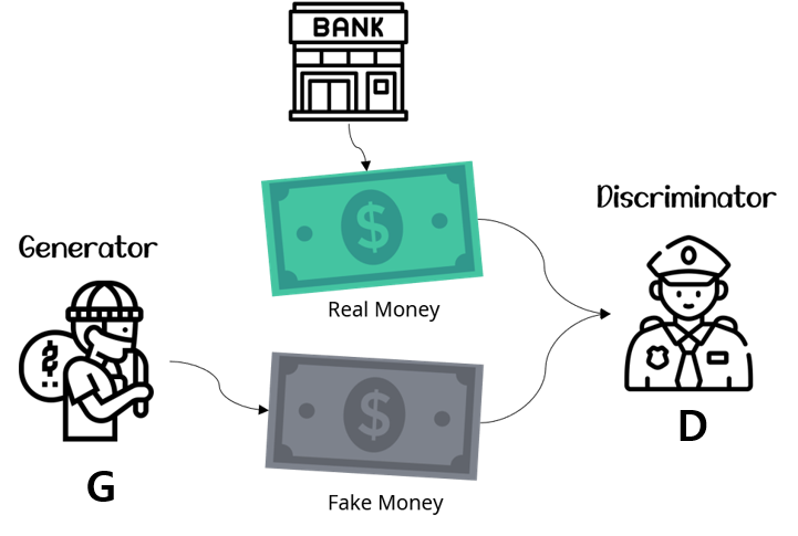 예를 들어, 위조 지폐범과 경찰은 서로 적대적이라고 할 수 있습니다. 왜냐하면, 위조지폐범은 일반인들이 진짜라고 믿게 만드는 fake money를 잘 생성하는 것이 목적이고, 경찰은 일반인들이 위조지폐를 가려낼 수 있는 방법들을 알려주는 것이 목적이기 때문입니다.