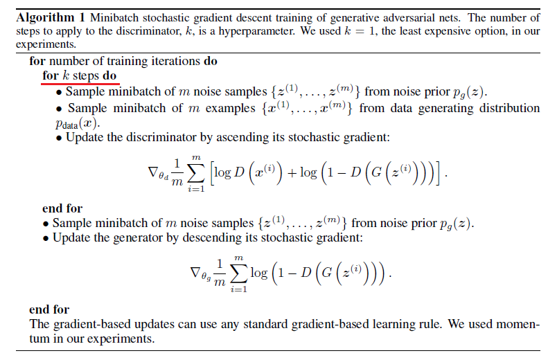 위의 알고리즘을 실제로 코딩할 때 아래와 같이 구현할 수 있습니다. (D학습시 따로 k step을 두진 않은 것 같네요)