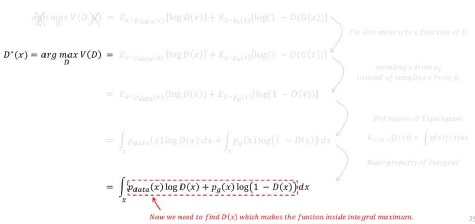 위와 같은 사실을 봤을 때, GAN이라는 모델은 generator와 관련된 loss가 아닌 discriminator와 관련된 loss에 의해 학습을 종료할지 말지 결정하게 되는 것이죠. 바꿔 말하자면, optimal discriminator의 값을 찾기 위해 discriminator(D) 부분만 고려하겠다는 것입니다.