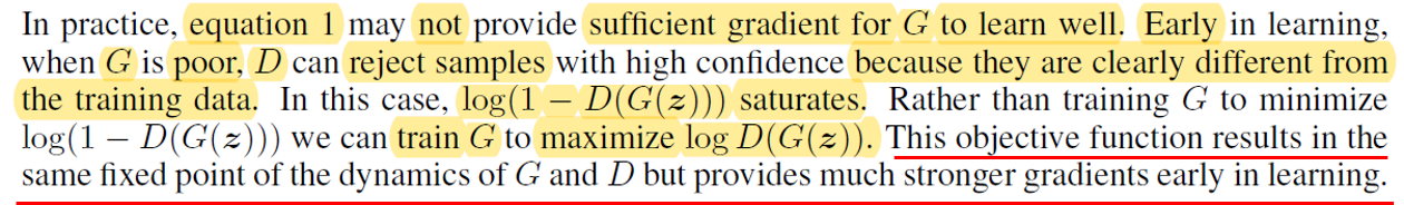 "a discriminative model D that estimates the probability that a sample came from the training data rather than G."라는 표현을 쓴 이유는 discriminative model이 기준을 'generative model로 부터 생성된 이미지인지를 판별하는 것'에 두는 것이 아니라, '실제 이미지인지를 판별하는 것'에 두는 것으로 봤기 때문이 아닌가 싶습니다. (CNN 관점에서 보면 background or negative sample 들을 잘 구별할 수 있게 학습하는 것과, foreground or positive sample들을 잘 구별할 수 있게 학습하는 것은 다른 문제이니까요. 예를 들어, 한 이미지에는 대부분 negative sample or background들이 많을 텐데, 이를 방치해두면 학습시 인공지능 모델이 background or negative sample만 잘 구분할 수 있도록 학습하게 될거에요. ) ← 혹시 이 부분에 대해서 다른 의견이 있으면 댓글로 남겨주세요!