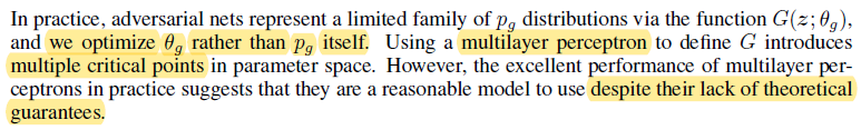 GAN을 통해 생성하는 데이터의 분포 \(p_{g}\)를 추정하고 최적화 하는 것이 아니라, \(p_{g}\)를 생성하는데 직접적인 영향을 미치는 parameter인 \(\theta_{g}\)를 추정하고 최적화 합니다. 또한, 엄밀히 말하자면 수학적인 증명에서는 generative model, discriminative model이 neural network를 사용한다는 언급이 없습니다. 그런데, Generative model을 MLP(multilayer perceptron; neural network; deep learning)와 같은 것으로 설정하게 되면 실제로 최종 loss function 자체가 convex하지 않을 수 있고, 즉 multiple critical points를 가질 수 있습니다. 하지만, 마법같은 MLP는 이러한 theoretical guarantees가 굳이 보장되지 않고도 나름 생성모델에서 잘 작동한다고 주장하고 있습니다.