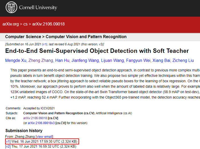 Swin Transformer의 저자 중 한 명이 Soft Teacher+Swin-L 모델 연구 개발에 참여한 것으로 보이고, Micro Soft와 항저우 과기대 (HUST) 팀원들이 같이 참여 한 것으로 보이네요. (올해는 항저우 과기대라는 이름을 더 자주 보는 듯합니다)
