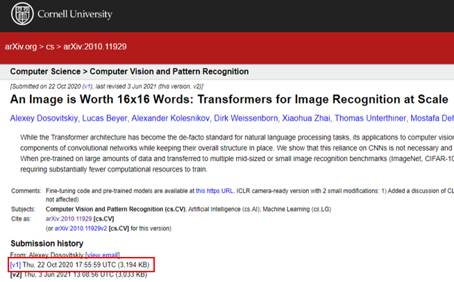 2020.10월 Deformable DETR로 인해 object detection 분야에서 Transformer의 관심을 보이기 시작했다면, 동시에 classification 분야에서는 2020.10월 ViT 모델의 등장으로 Transformer에 대한 관심이 뜨거워졌습니다. (Transformer라는 개념을 처음 소개한 것도 google이고, Transformer를 object detection에 처음 접목시킨 DETR도 google이고, Transformer를 (vision) classification에 처음 접목시킨 것도 google이네요 ㅎㄷㄷ...)