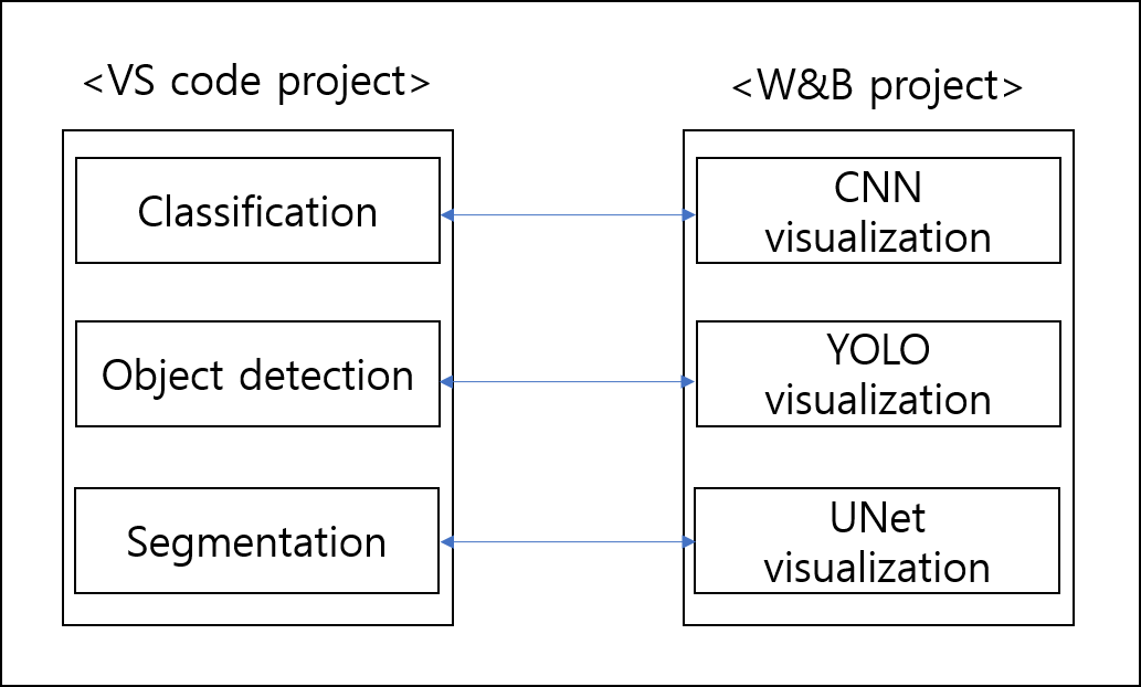 VS Code에서도 task 마다 별도의 project를 만들게 됩니다. 그렇다면 각각의 task마다 visualization 하려는 정보들도 모두 다르겠죠? 그래서, task 별로 wandb의 visualization project를 만들어 주는것이 좋습니다. (그래야 task 마다 visualization 기록들을 용이하게 관리 할 수 있어요.)