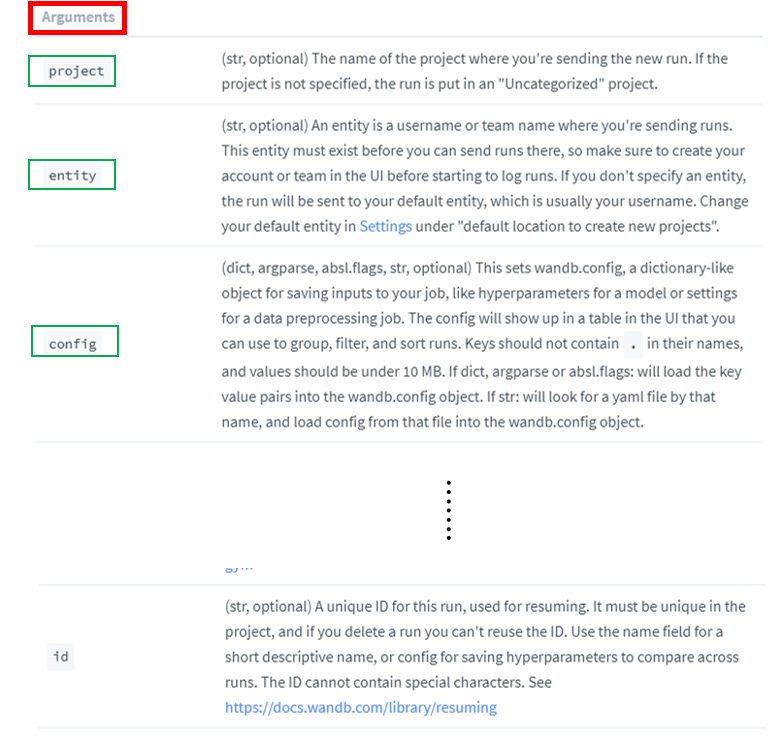 wandb.init() 함수 인자들은 아래와 같이 설명이 나와있습니다.