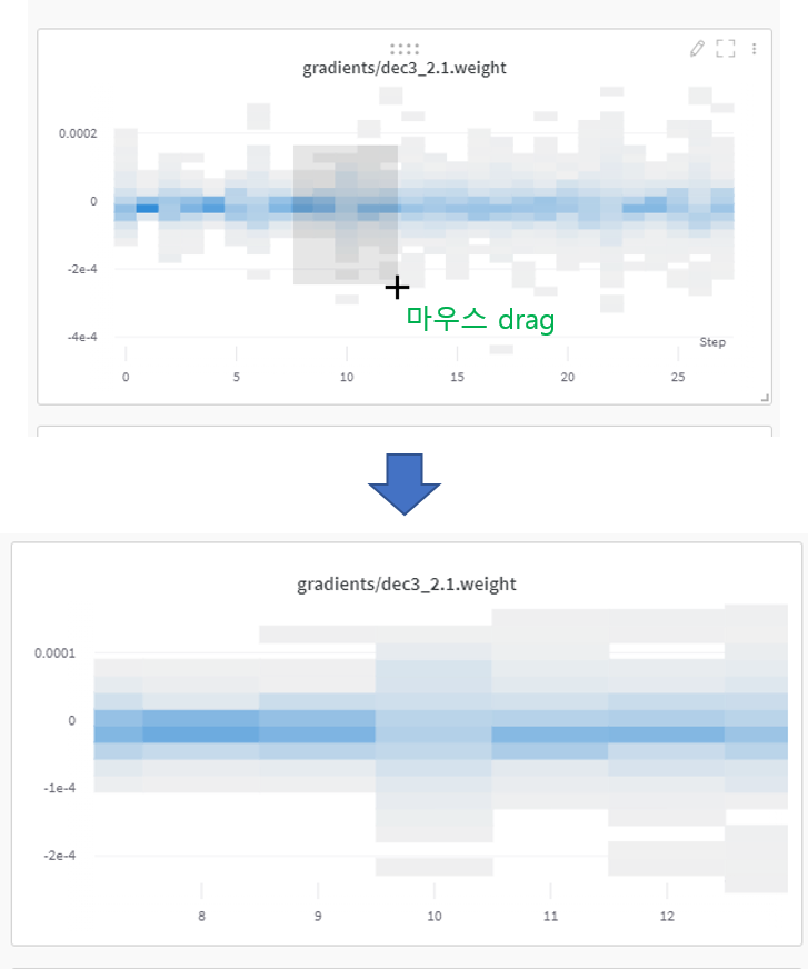 그리고 특정 epoch 부분들의 gradient 값을 디테일하게 보고 싶으면 해당 부분을 drag 하면 됩니다.