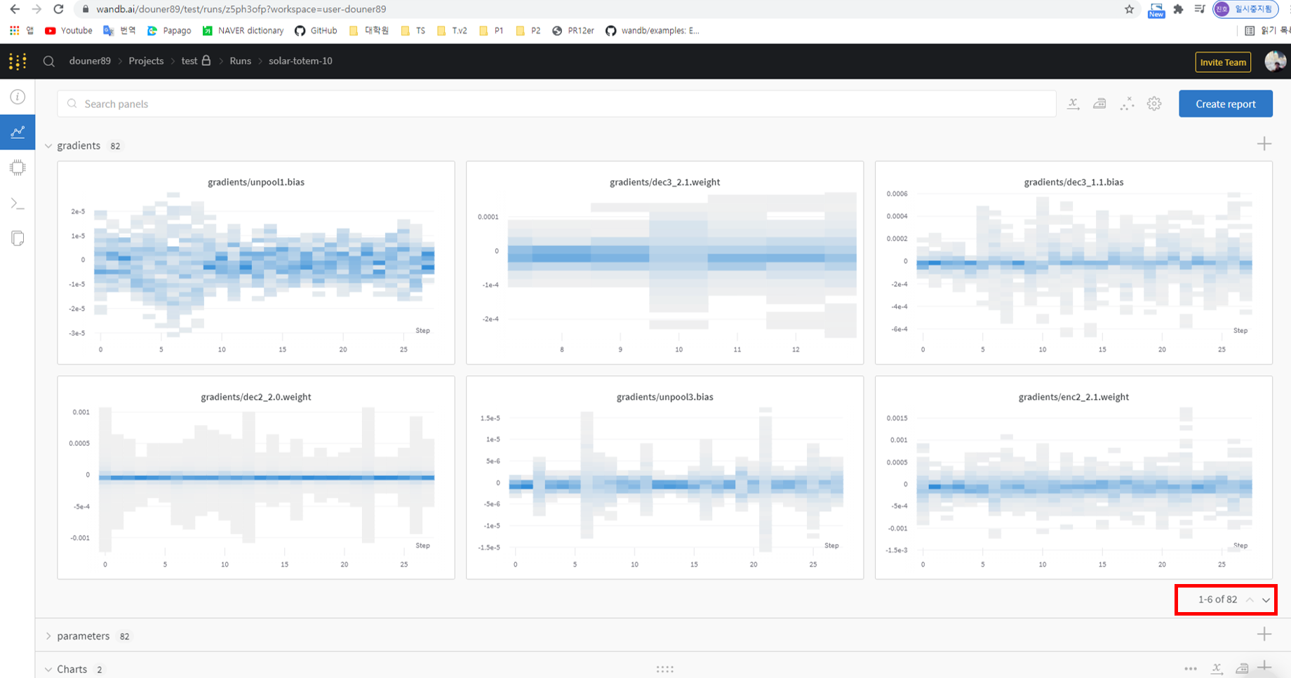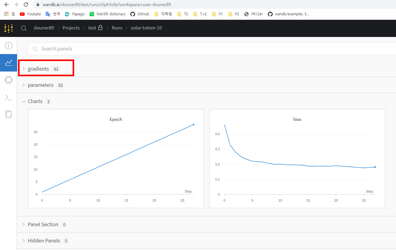 또한, 앞서 "wandb.watch()" 함수를 통해 gradient, parameters 값을 visualization 할 수 있다 언급한 바 있습니다.
