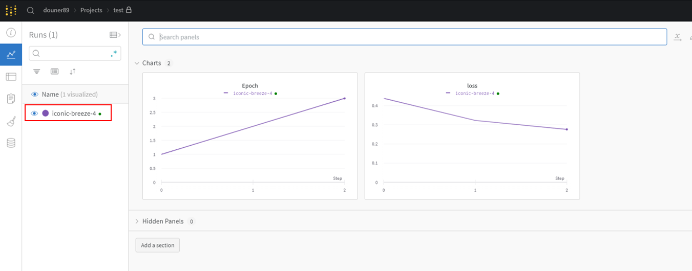 하지만, 코드를 실행시킨 후, charts 부분을 보면 아래와 같이 wandb.log()에 설정했던 log들이 기록됨을 알 수 있습니다. "wandb.log()"에 epoch과 loss를 설정했기 때문에 epoch, loss값이 visualization 되는 것을 볼 수 있습니다.