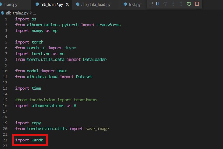 ("alb_train2.py" 파일은 VS code 상에서 UNet segmentation project에 속해있는데, 해당 project가 base 아나콘다 가상환경 interpreter에 연동되어 있습니다. 앞서 base 아나콘다에 wandb 패키지를 설치했기 때문에 에러없이 import wandb 를 수행할 수 있습니다.)