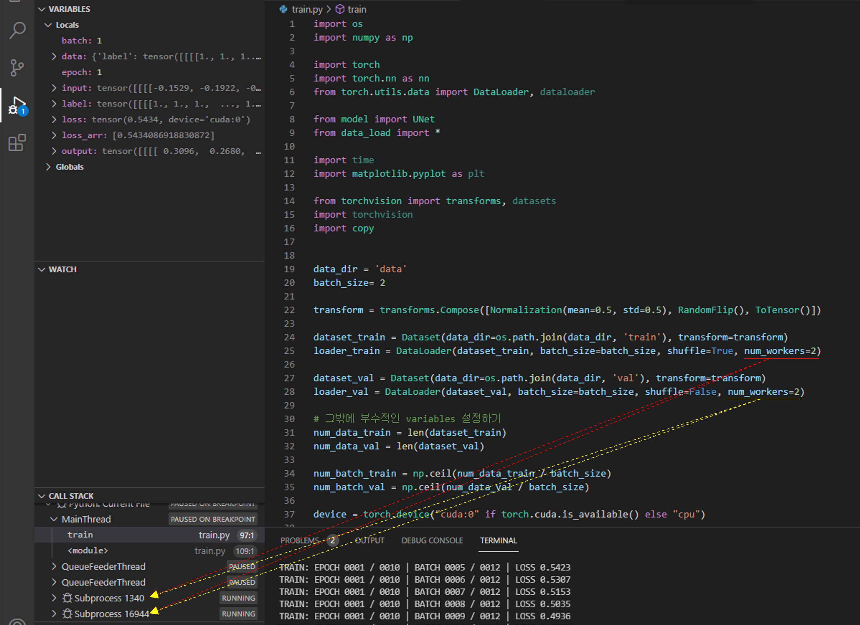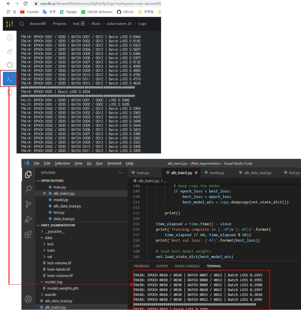 아래 빨간색 네모 박스는 log 관련 정보를 보여주는 곳인데, 학습 시 vs code에 기록되는 log 들을 그대로 볼 수 있습니다.