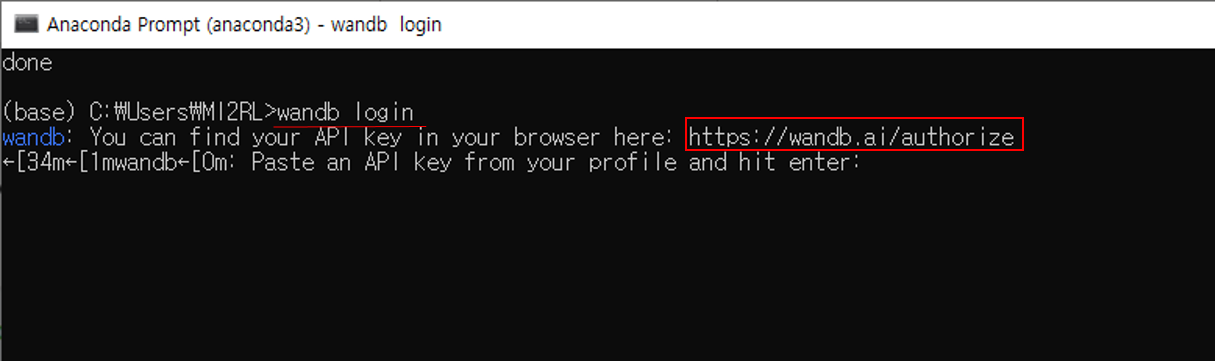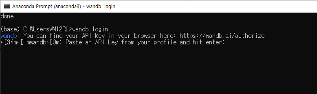 - wandb login 명령어 입력