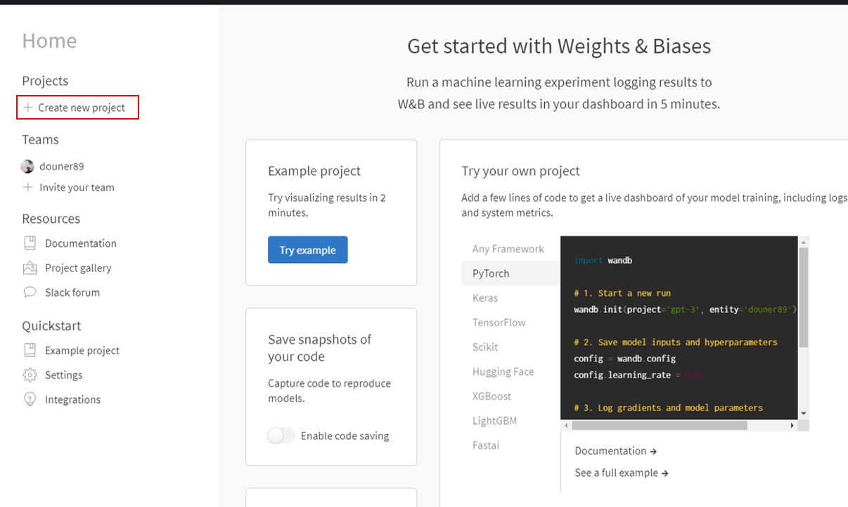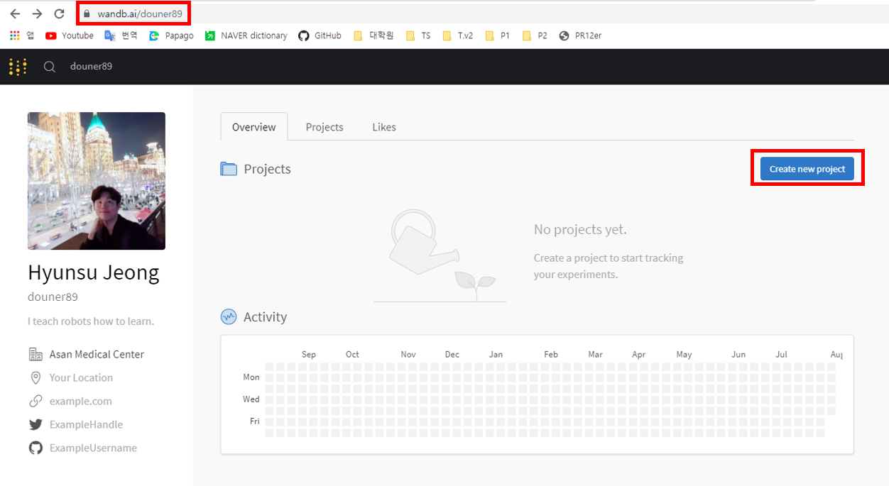 아니면 아래 사이트(="wandb.ai/username")에 직접 접속해서 우측에 있는 "Create new project"를 클릭해주세요.