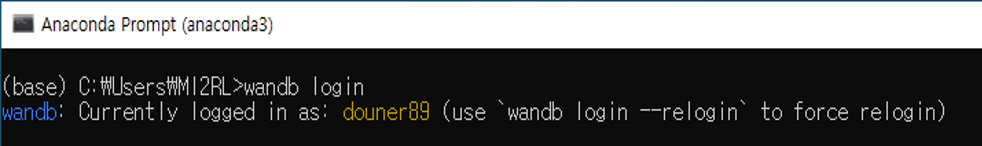앞서 언급했듯이 "아나콘다 가상환경을 VS Code interpreter에 연동시켜 사용하고 있고", Weight and Biases 웹 사이트와 연동하여 visualization 결과"를 볼 수 있기 때문에, 아나콘다 가상환경에서 Weight and Biases 웹 사이트와 연동시켜주어야 합니다.