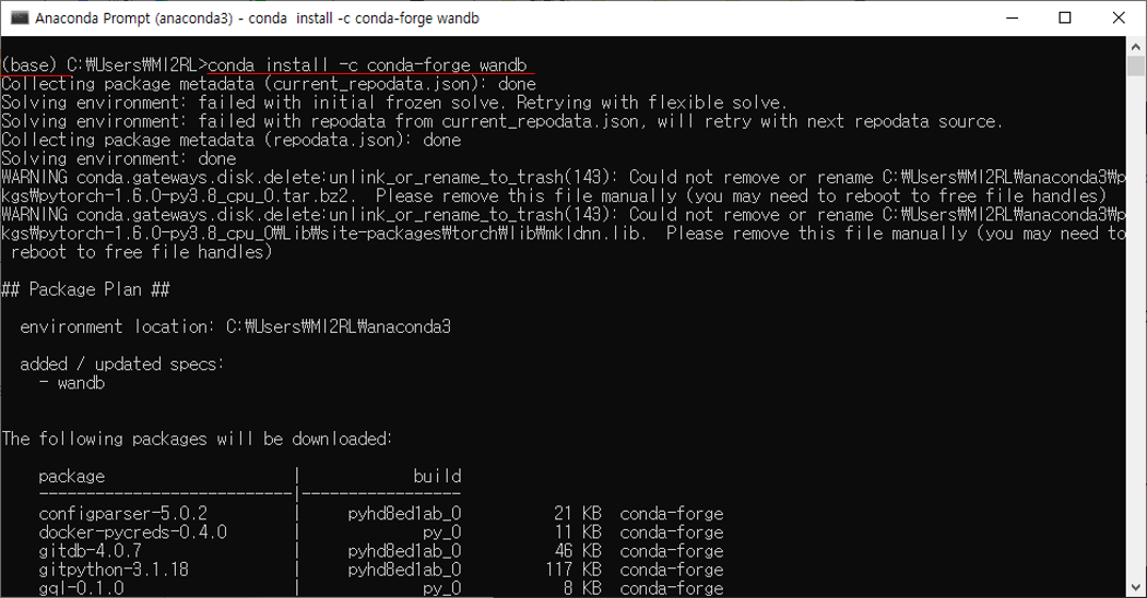 먼저, 제 경우에는 아나콘다 가상환경을 VS Code interpreter에 연동시켜 사용하고 있기 때문에 아나콘다에 wandb 패키지를 설치하도록 하겠습니다.