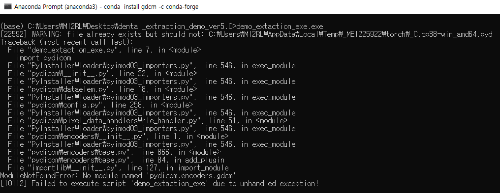 만약 pydicom 모듈이 포함된 실행파일을 만들었다면 아래와 같은 에러 메시지가 출력 될 수 도 있습니다.