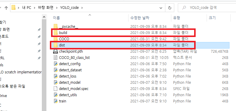 - dist 폴더: distribute(배포)의 약자입니다. 즉, 배포되는 파일이 들어 있는 디렉토리라고 보시면 됩니다. dist 폴더에 실행파일이 만들어졌음을 확인할 수 있습니다. 나중에 시연할 때에는 아래의 실행파일이용하면 됩니다.