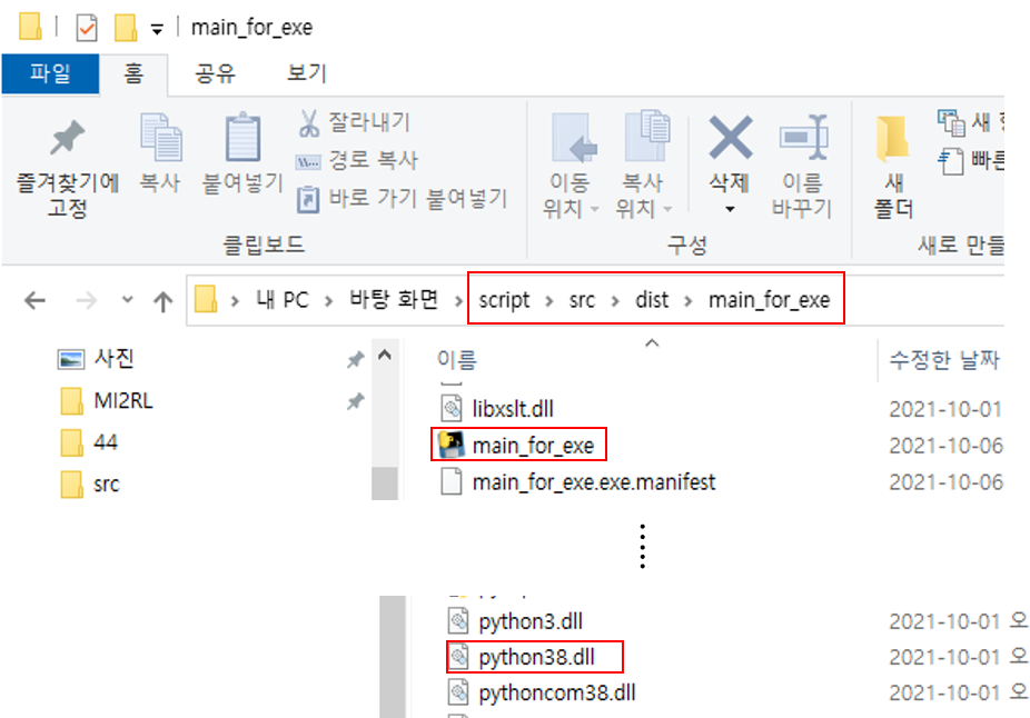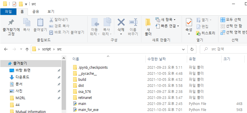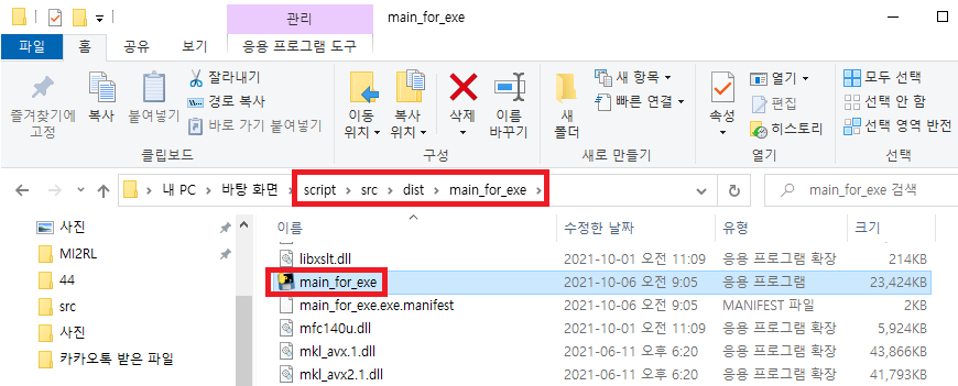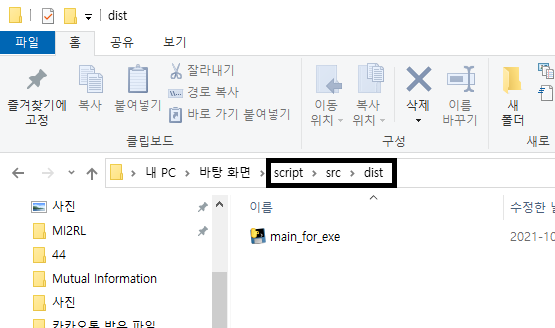 그래서, src\dist 폴더에 main_for_exe.exe 파일에 모든 모듈을 통합하도록 --onefile 옵션을 주어 파일을 다시 컴파일을 해줍니다.