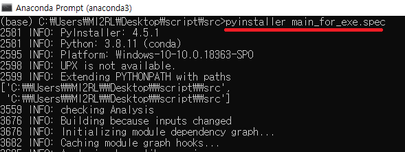 3. 원하는 python 파일을 실행파일로 바꿔주기 위한 명령어를 입력합니다.