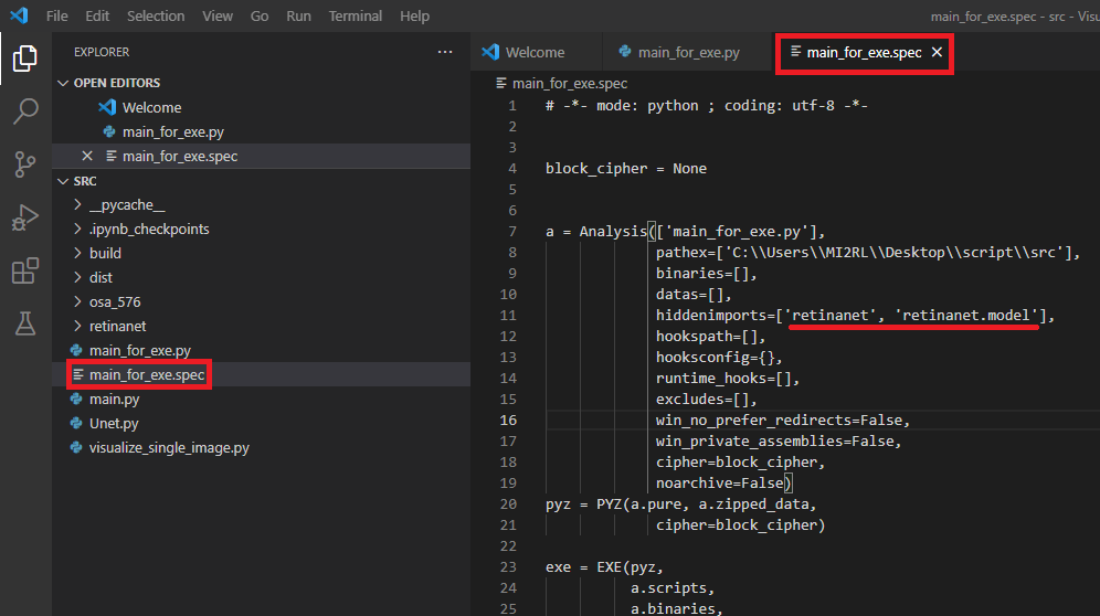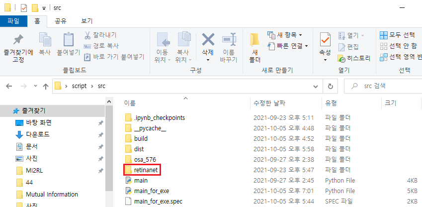 이때, 'main_for_exe.py'의 실행파일을 만들기 위해서는 추가된 retinanet 모듈의 path도 잡아주어야 합니다.