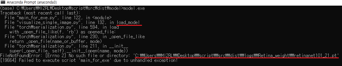 아래 디렉토리를 확인해 보니, main_for_exe.exe 실행 파일을 수행하면 현재 실행시킨 경로를 기준으로 파일경로가 재설정되는 듯했습니다. 자세히 말하자면, vscode 상에 'retina_model_path를 설정하는 코드를 보면 'prefix' 변수명에 'logs\Retina_weight\~' 경로를 합쳐주는걸로 되어있는데, vscode 상에서는 script 폴더에서부터 접근하는 반면,