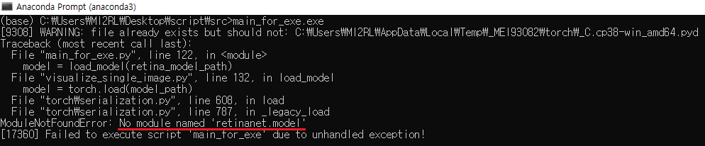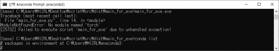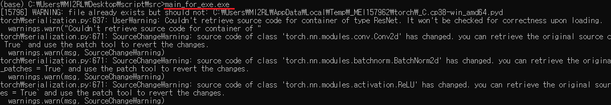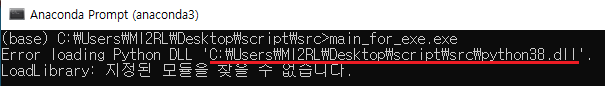 그러자, 앞서 언급한 경로문제는 해결되었지만, src\dist\main_for_exe 폴더에 main_for_exe.exe가 생성될 때 같이 생성된 다른 모듈들과의 호환문제가 발생했습니다.
