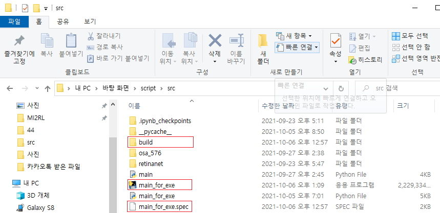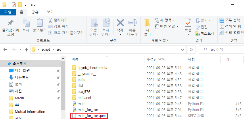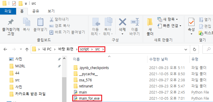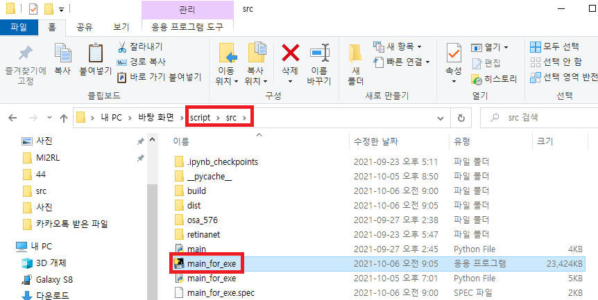 지금부터는 아래와 같이 'main_for_exe.py' 파일을 실행파일로 만들어보겠습니다.