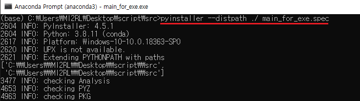 만약, 위와 같이 main_for_exe.exe 파일을 src\dist 폴더에서 빼내지 않고, 애초에 main_for_exe.exe 파일을 main_for_exe.py 폴더가 위치한 src 폴더에 생성시키려면 아래와 같이 distpath 옵션에 src 폴더경로를 입력해주면 됩니다.
