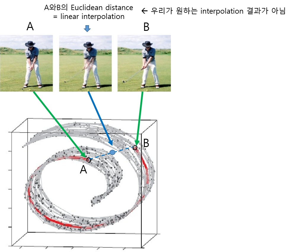 예를 들어, 의미적으로 가깝다고 생각되는 고차원 공간에서의 두 샘플(A,B)간의 실제 Euclidean distance는 먼 경우가 많습니다.그 이유는 “curse of dimension”으로 인해 의미 있는 manifold를 찾지 못했기 때문이죠.