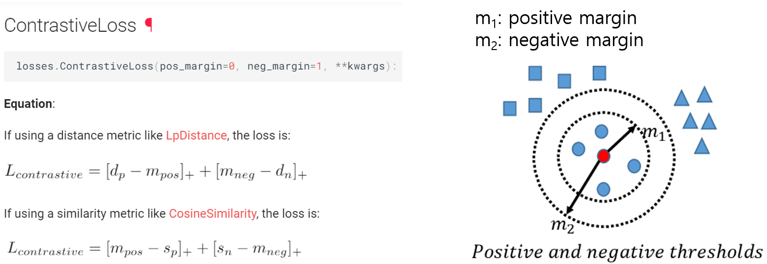 Pytorch에서는 negative pair 뿐만 아니라, positive pair에 대한 margin 값도 설정해놓고 있습니다. (참고로 아래 LpDistance는 Euclidean distance를 의미합니다)