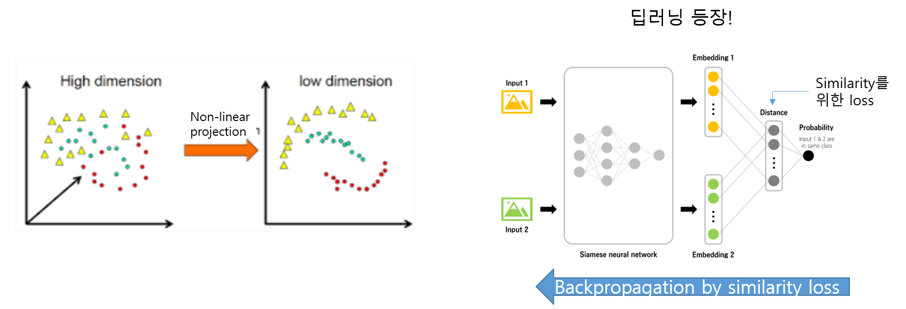 - 그래서, 유사도 기준에 알맞도록 고차원 데이터를 저차원으로 dimension reduction 하는 방법이 중요합니다.