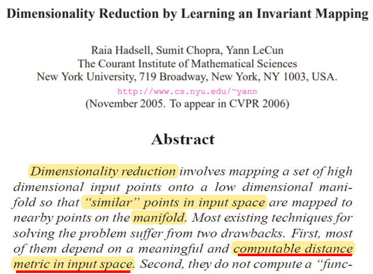 사실, contrastive loss라는 용어와 개념은 "Dimensionality Reduction by Learning an Invariant Mapping"이라는 논문에서 기원했습니다. 아래 논문의 저자로 우리가 익히 알고 있는 'Yann LeCun' 교수님도 있으시네요.